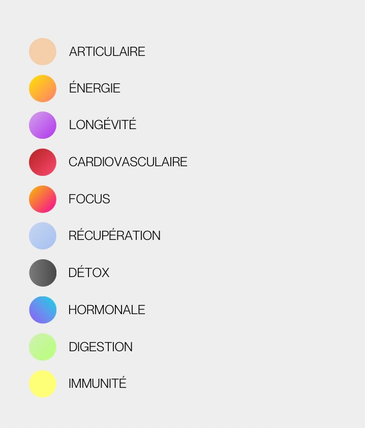 Énergie - détox - récupération - santé cardiovasculaire - santé hormonale - immunité - digestion - focus - longévité